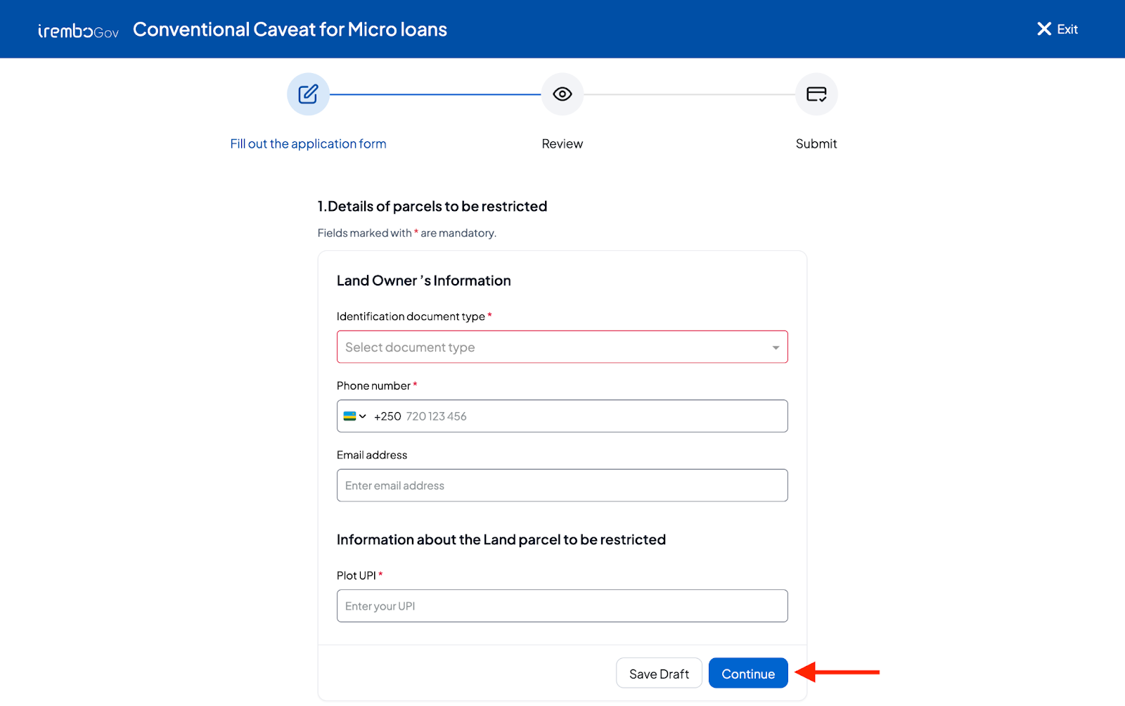 In the first section of the application, you will be prompted to add the landowner’s information, including their identification document type and number, as well as contact details. Additionally, you will need to provide information about the land parcel to be restricted, which includes the plot UPI.