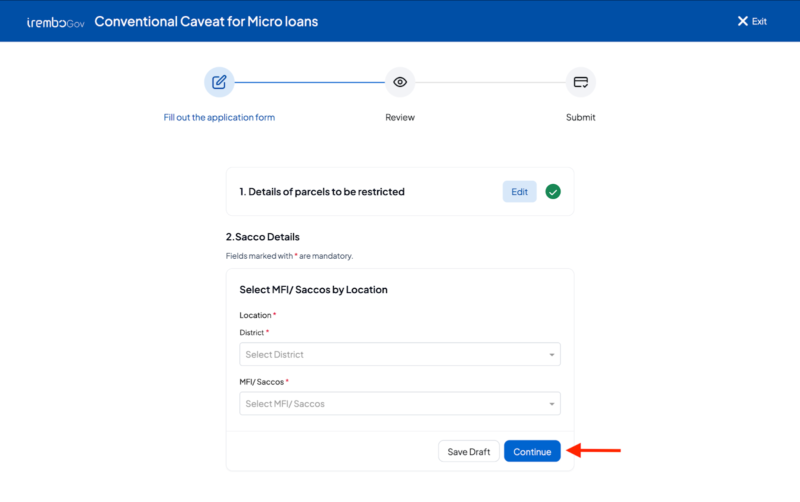 Select the Microfinance Institutions and Savings and Credit Cooperative Societies (MFI/Saccos) by location, depending on the User’s preferences, then click Continue.