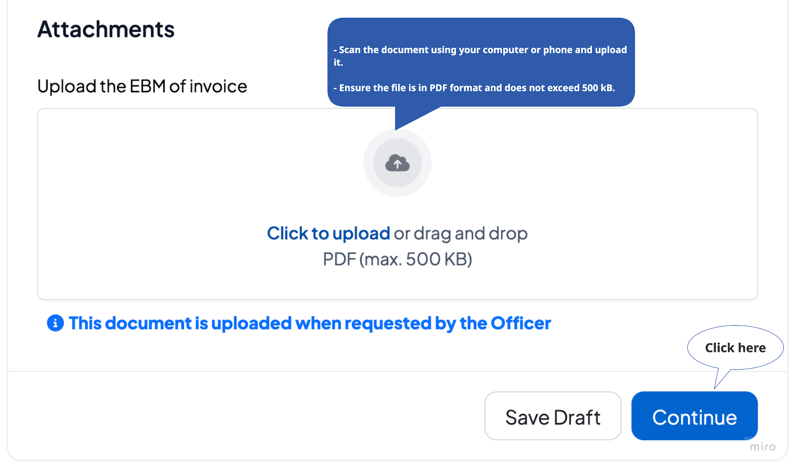 Step 2: When the application gets provisionally approved, it will be returned to you for uploading the EBM invoice (if requested by the officer) and resubmit.