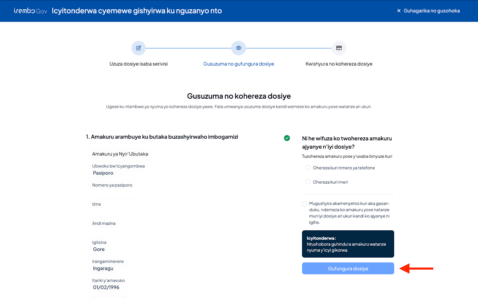 Rebera hamwe n’usaba ko amakuru yatanze ari yo, hanyuma ukande kuri “Gufungura dosiye”.