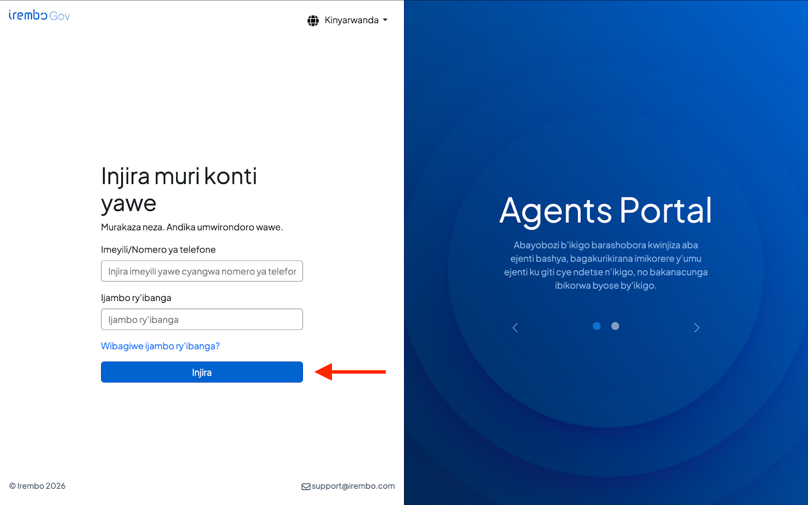Sura urubuga rwa Irembo rwaba ajenti kuri agent.irembohub.com winjire muri konti yawe.