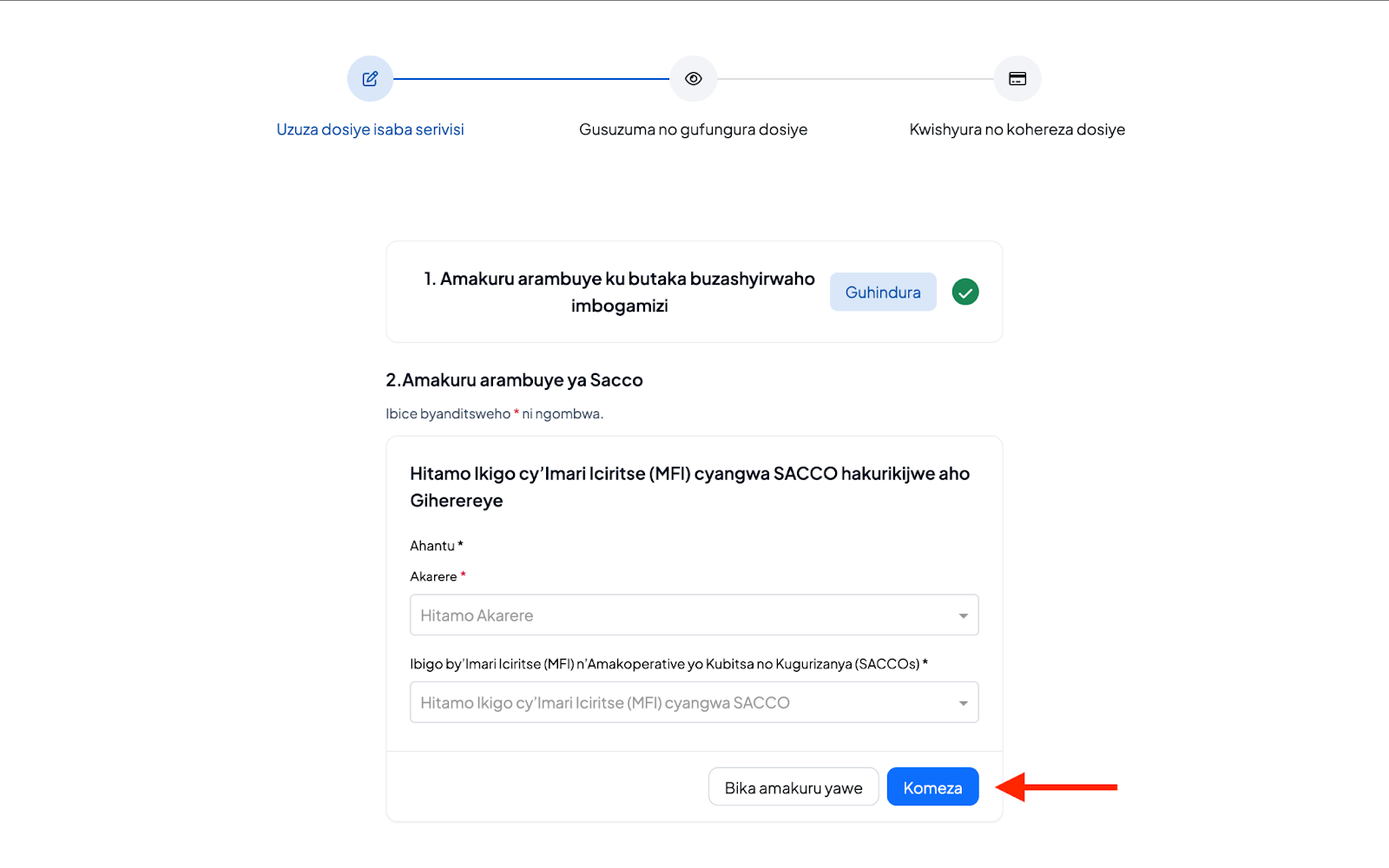 Hitamo Ikigo cy’imari iciriritse (MFI) cyangwa SACCO hakurikijwe aho giherereye bitewe n’ubushake bw’usaba, hanyuma ukande Komeza.